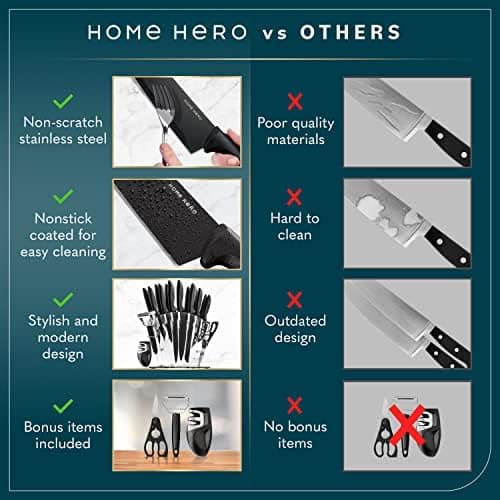 • One of a kind stainless steel knife set – Home Hero brings together a unique mix of quality sharpness, great value, durability & professional crafted accuracy. Now anyone, newbie cook or master chef can enjoy cooking much faster, easier, cleaner. To maintain sharpness, handwash knives with mild soap and warm water. Always avoid using the dishwasher for sharp knives to prevent dulling the blades over time.