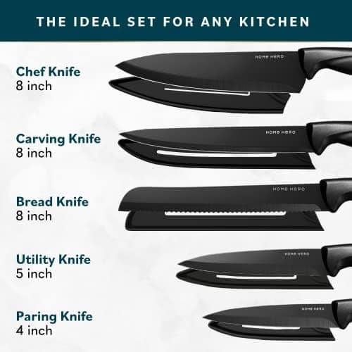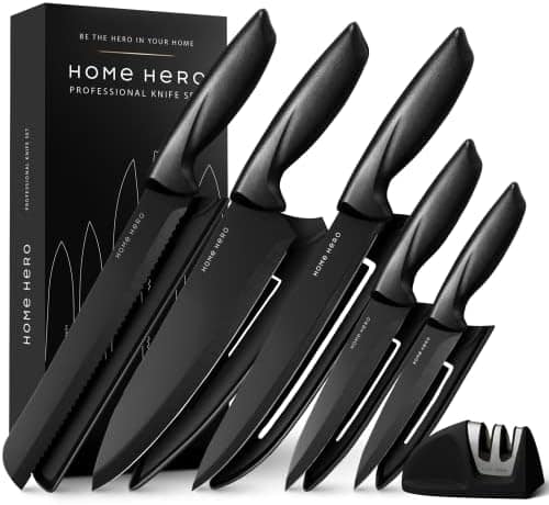 • Premium Stainless SteelĀ – Made with durable 3Cr13 stainless steel, this sharp kitchen knife set will help you slice, dice, and chop to your heart’s content. And to keep your kitchen kives sharp for longer, the sheaths will protect the blades when not in use!