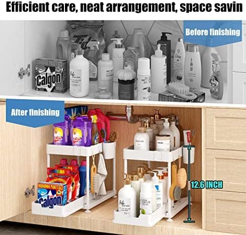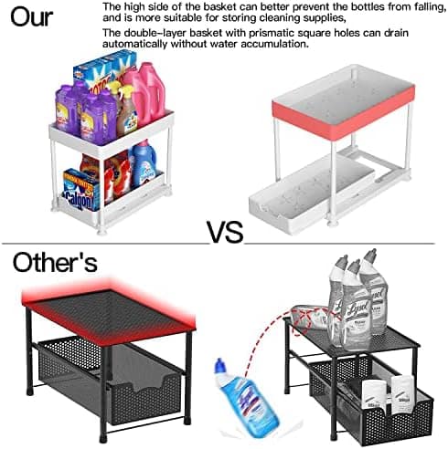 • 【Sliding Storage Drawer】The under sink organizer is designed to be pulled out which is more convenient to use than other normal storage organizers. The bottom sliding drawers can be pulled out by the handles for easy access to items behind the front row, making picking and taking more flexible and easier in limited space.